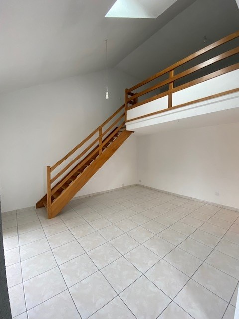 ANGERS-DOUTRE : Appartement type duplex, 3ème étage, comprenant entrée avec placard, salon-séjour avec balcon, kitchenette aménagée, chambre en mezzanine avec placard, salle de bain, WC avec placard. Parking privé, cave, local vélos. disponible mi février 2026. Loyer : 610.00 € + charges : 64.00 € (communs + eau froide)