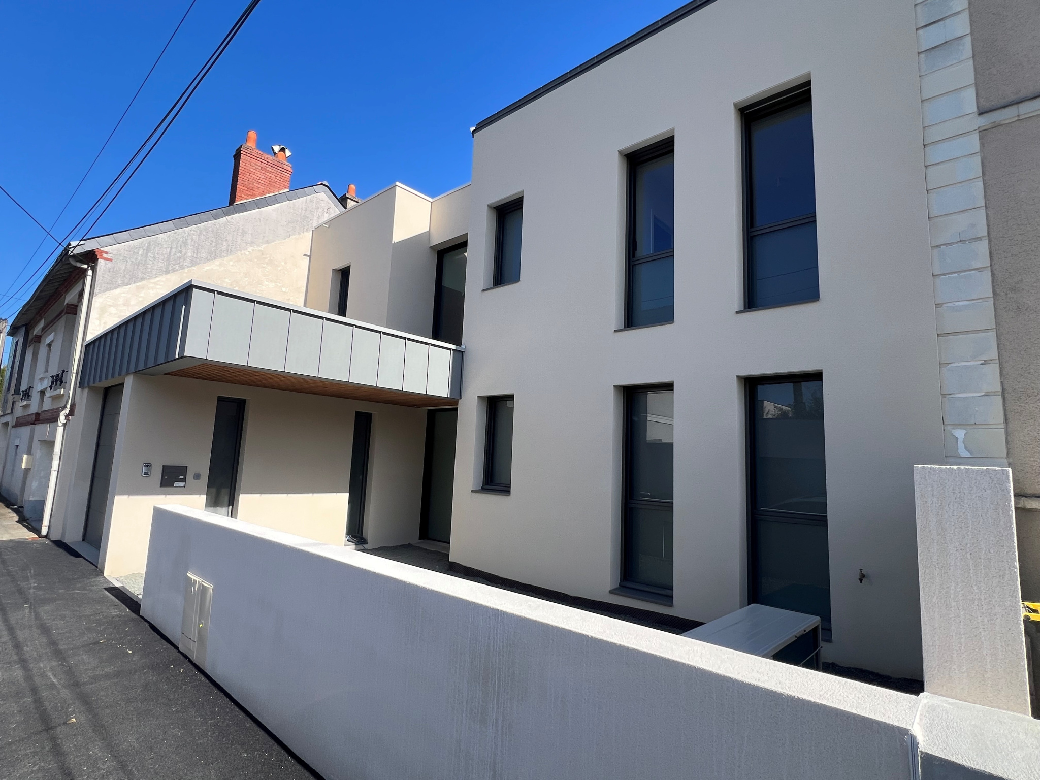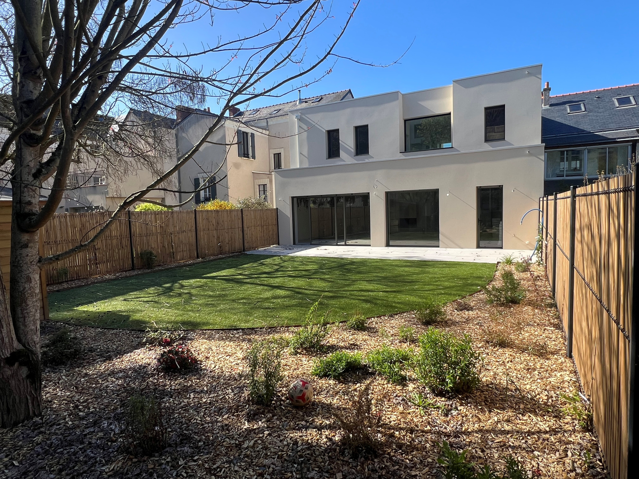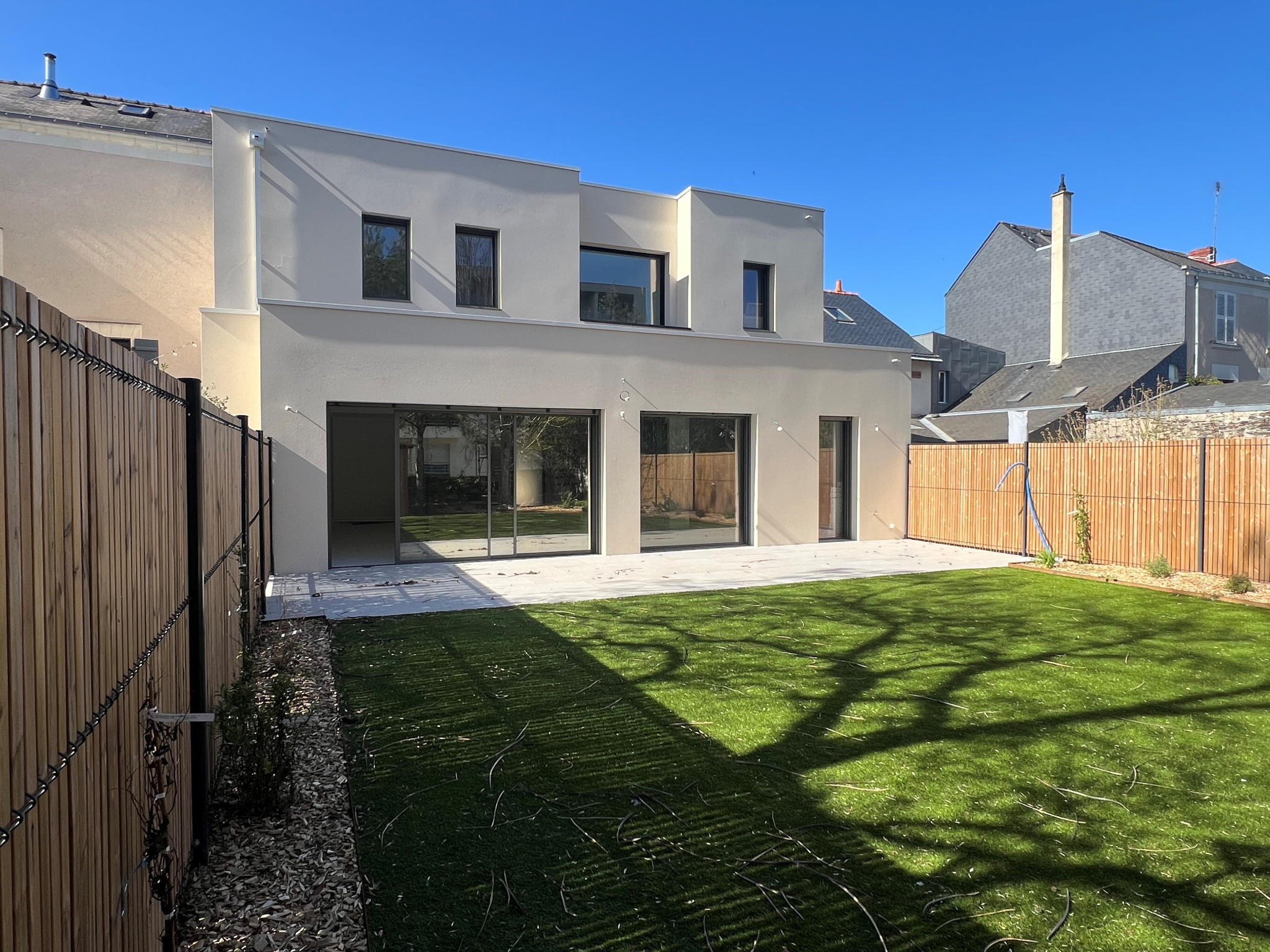 ANGERS – Quartier prisé de La Madeleine Maison d’architecte neuve (2025-2026) – 202,80 m² habitables Située dans le très recherché quartier de LA MADELEINE, cette superbe maison d’architecte allie élégance contemporaine, volumes généreux et prestations haut de gamme. Dès l’entrée, vous serez séduit par les espaces et la luminosité. Le rez-de-chaussée s’ouvre sur une vaste réception de près de 80 m², agrémentée d’une cheminée et de larges baies vitrées donnant accès à une grande terrasse carrelée et au jardin aménagé. Une cuisine fonctionnelle avec cellier complète cet espace de vie. Une chambre avec salle d’eau privative permet une vie de plain-pied confortable. À l’étage, un palier lumineux, sublimé par de grands châssis fixes, dessert quatre belles chambres, un dressing ainsi que trois salles d’eau et deux WC, offrant un confort idéal pour une famille. Un garage carrelé vient parfaire l’ensemble, ainsi qu’un jardin soigné avec abri en bois.